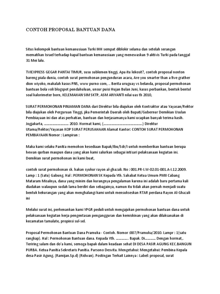 Dengan dibuat surat permohonan tersebut, diharapkan donatur memberikan sejumlah dana yang dikolektifkan oleh panitia agar pembangunan tersebut bisa berjalan lancar. Jun 04, 2021 · contoh surat permohonan bantuan dana. Dec 27, 2016 · adapun maksud dan tujuan penyusunan proposal ini adalah untuk memenuhi tugas mata kuliah kewirausahaan tentang membuat proposal usaha dengan baik dan benar yang di bimbing oleh ibu indah. Jun 17, 2020 · melalui gambaran contoh proposal pengajuan dana tersebut, anda dapat membuatnya dengan lebih mudah dan cepat. Penyalur yang ditunjuk oleh kemenparekraf bertugas mengirimkan dana bantuan ke rekening penerima bantuan sesuai dengan kontrak/perjanjian kerjasama.